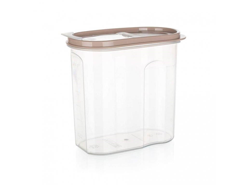 Transparentní plastová dóza RIVA o objemu 1,75 l, s víčkem v hnědé barvě. Dóza je praktickým pomocníkem na ukládání těstovin, luštěnin, mouky a jiných potravin.