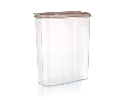 Transparentní plastová dóza RIVA o objemu 4 l, s víčkem v hnědé barvě. Dóza je praktickým pomocníkem na ukládání těstovin, luštěnin, mouky a jiných potravin.
