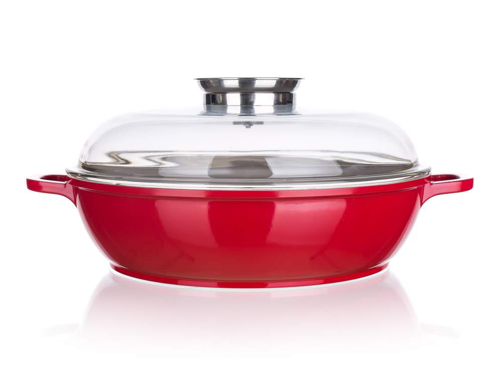 Pánev paella Madeira Red 28 x 7 cm s nerezovým knobem, dvouvrstvá keramická povrchová úprava ECL v šedé barvě, tělo a úchyty sytě červené. Nepřilnavý keramický povrch usnadní přípravu jídla s minimálním množstvím tuku. Maximální provozní teplota pro pánev 380 st. C, pro skleněnou poklici 180 st. C. Pánev je vhodná na všechny typy varných desek včetně indukce.