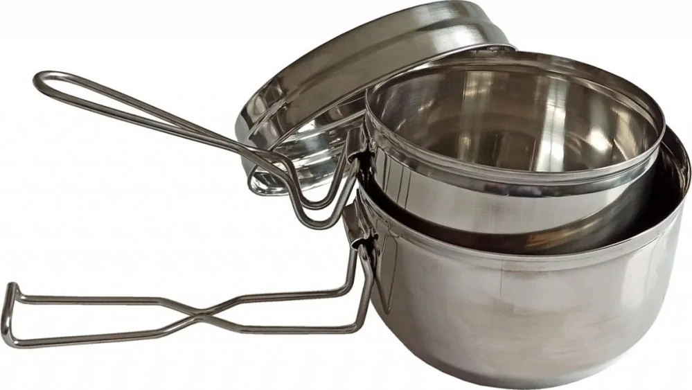 3dílná kempingová sada STORE LINE 1 obsahuje - 1x ešus se sklopným držadlem a víko o průměru 15 cm, objem nádoby 1,4 l. 1x ešus se sklopným držadlem o průměru 13 cm a objemu 1 l. Sada je vyrobena z nerezu 14/1, síla materiálu 0,40 mm.