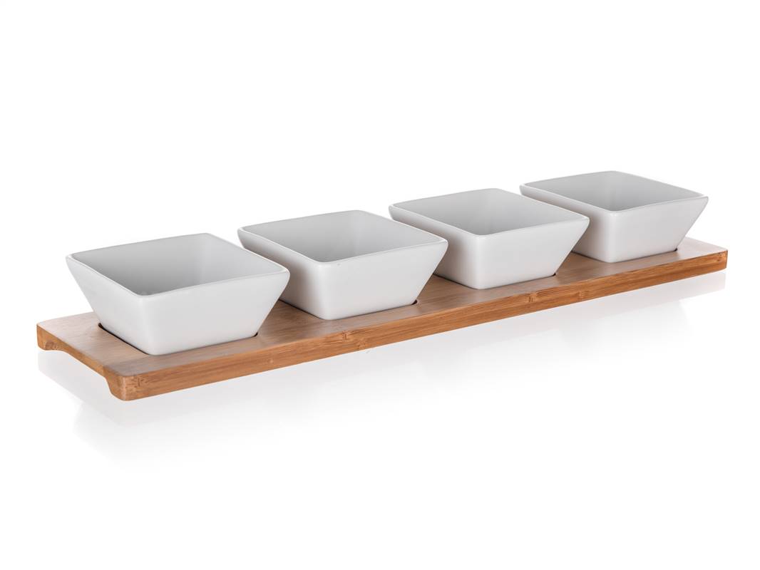 Sada servírovacích keramických misek Brillante Bamboo na bambusovém prkénku o rozměru 40 x 9,5 cm, je praktická sada pochutinových misek o velikosti misky 8 x 8 x 4 cm.