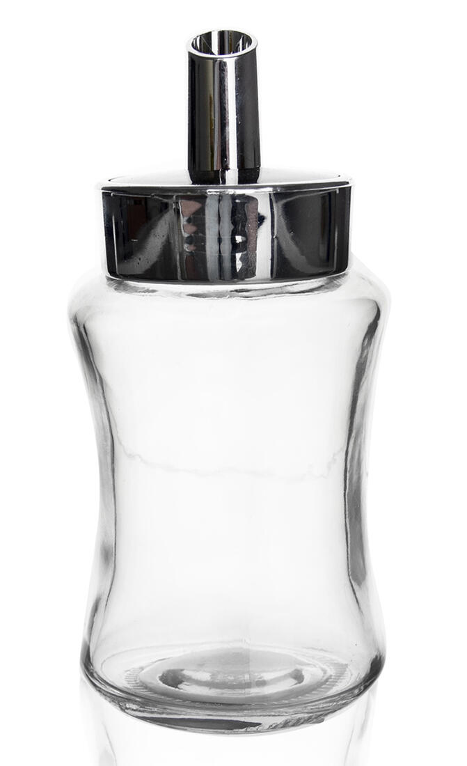 Dávkovací cukřenka pro domácnosti i gastronomická zařízení, vyrobena z plastového, pokoveného víčka a skla.