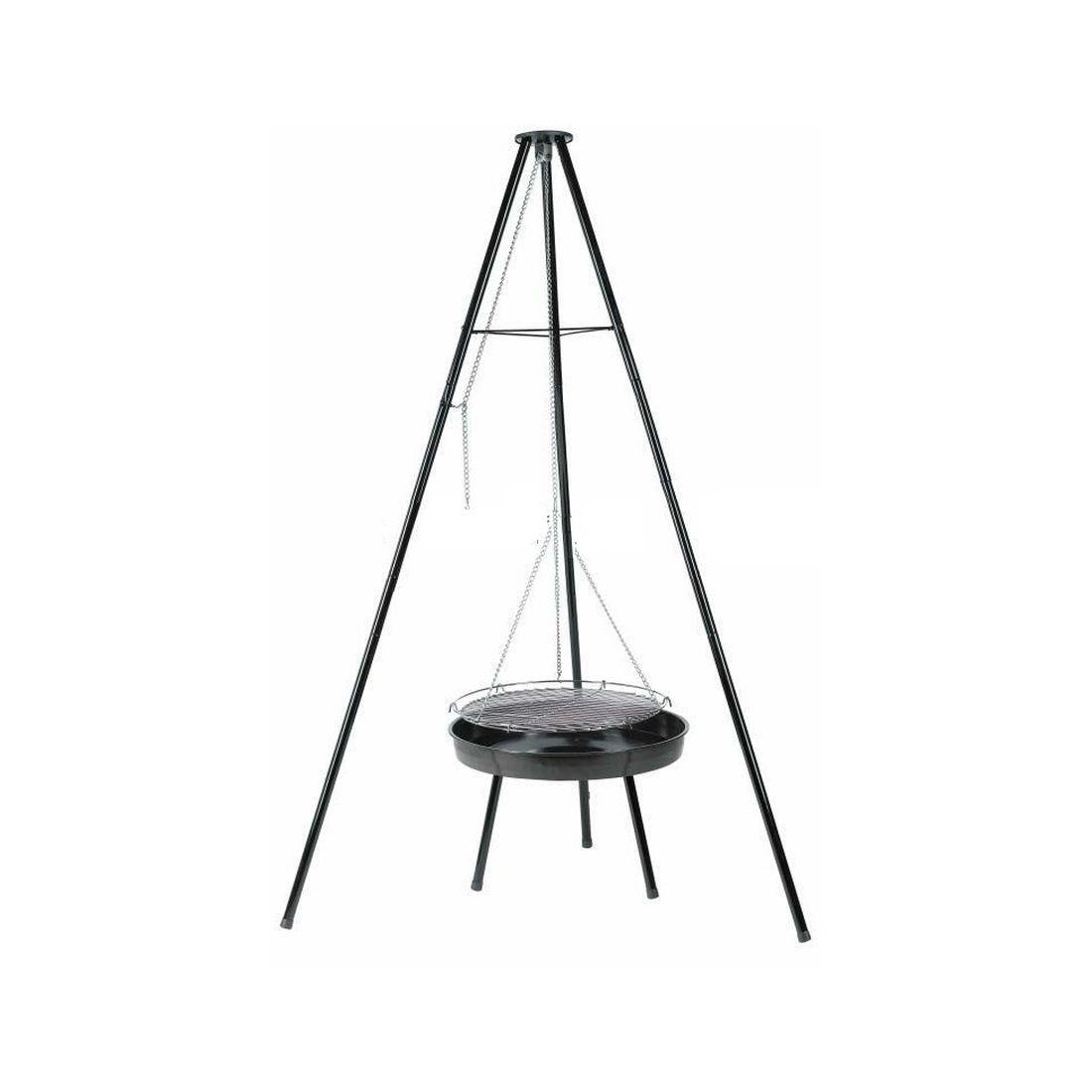 Grilovací trojnožka na dřevěné uhlí nebo brikety.