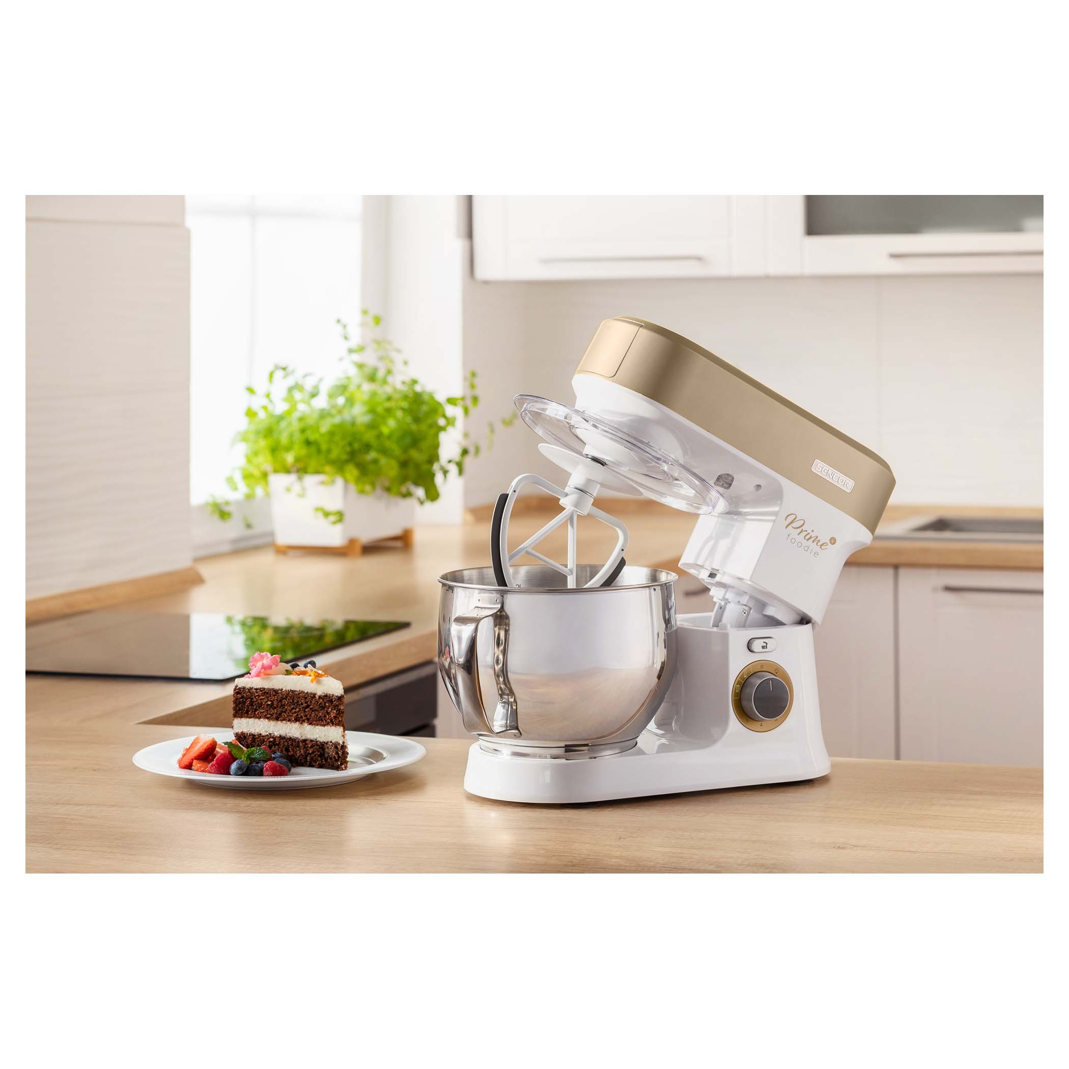 Schopnost planetárního mixování (dvojitá rotace nástavce) umožňuje tomuto kuchyňskému pomocníkovi rovnoměrně a dokonale míchat, šlehat i hnětat jednotlivé ingredience. Nástavce zvládnou pracovat s 0,8 l tuhého a s 2,7 l jemného těsta, pro který volte FLEXI šlehač s FLEXI metlou.