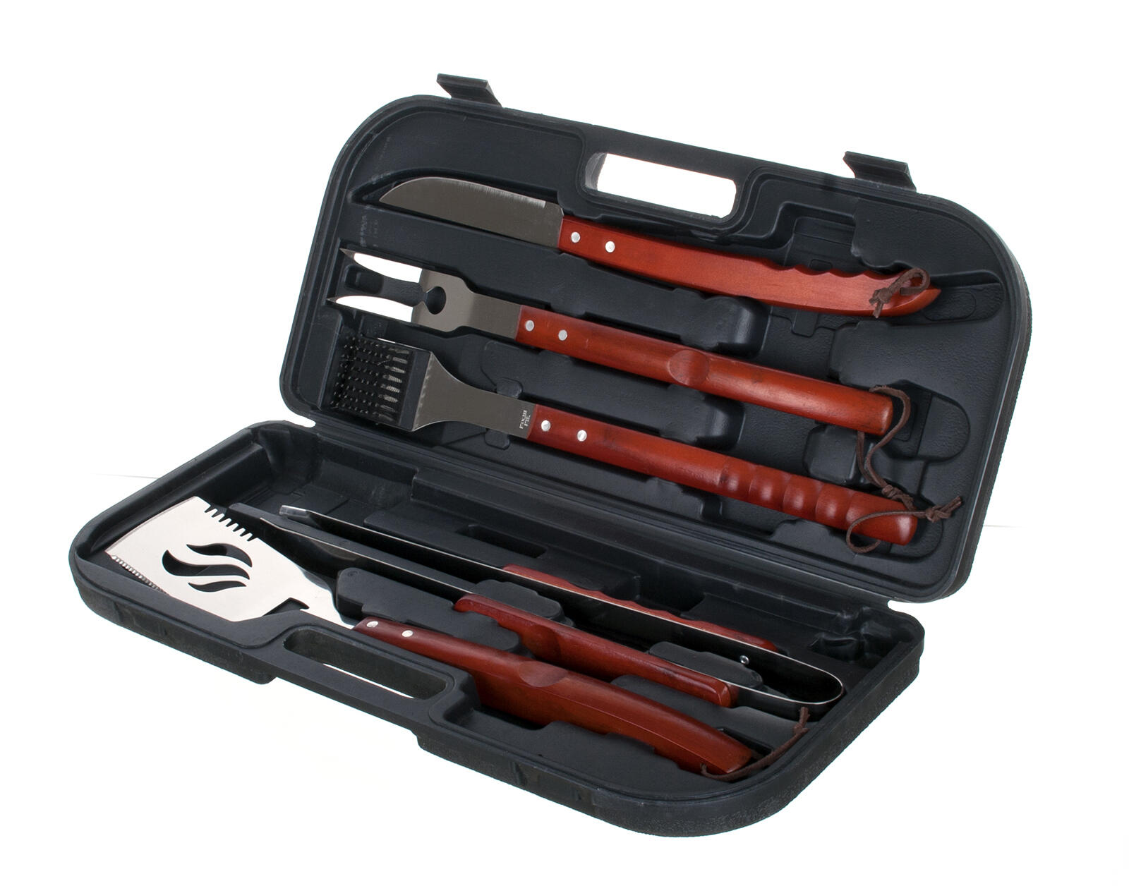 Souprava na grilování BBQ, 5 ks, v kufříkuNerezová sada s dřevěnou rukojetí v plastovém kufříku obsahuje: čístící drátěný kartáč 48 cm, grilovací zubaté kleště 45 cm, obracečka 48 cm, porcovací nůž s čepelí o délce 45 cm, vidlička se 2 hroty 46 cm.