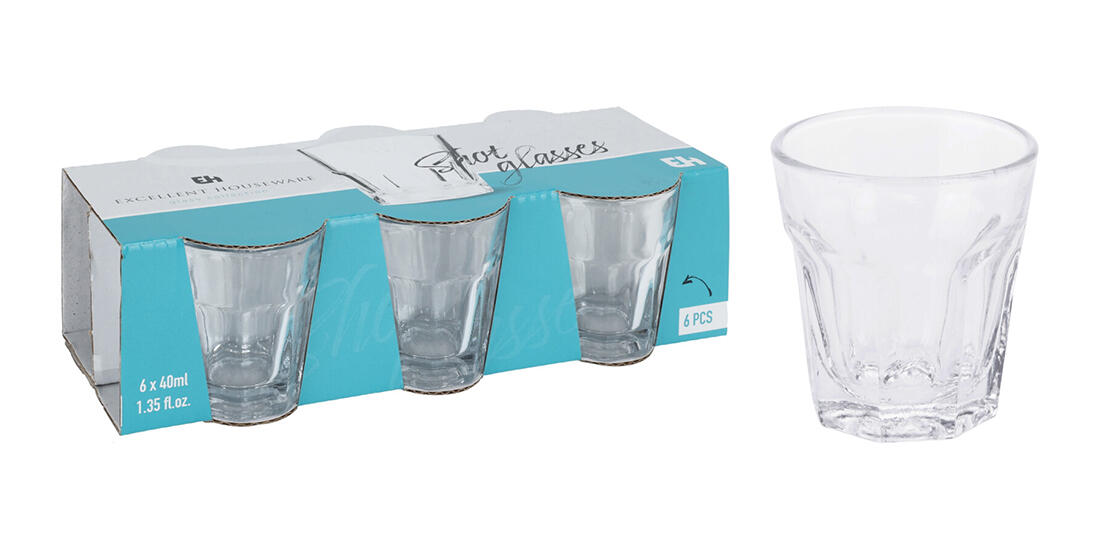 6dílná sada odlivek 40 ml se skládá z čirých skleněných odlivek se silnější stěnou.