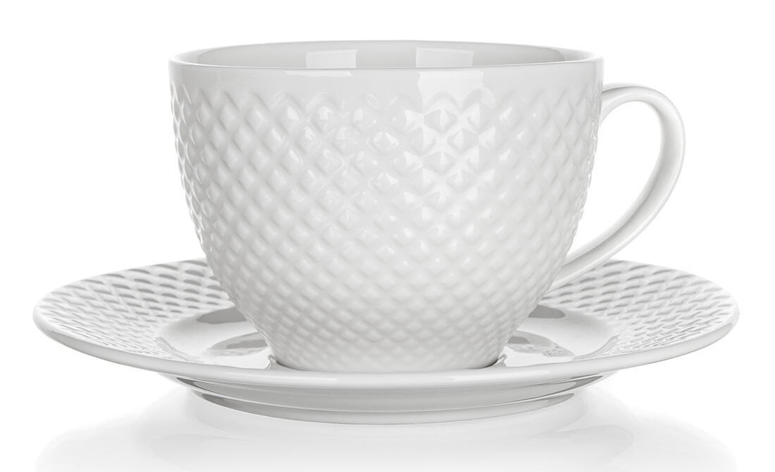 Šálek DIAMOND 220 ml s podšálkem v barvě bílé se zdobným reliéfem, vyrobený z keramiky.