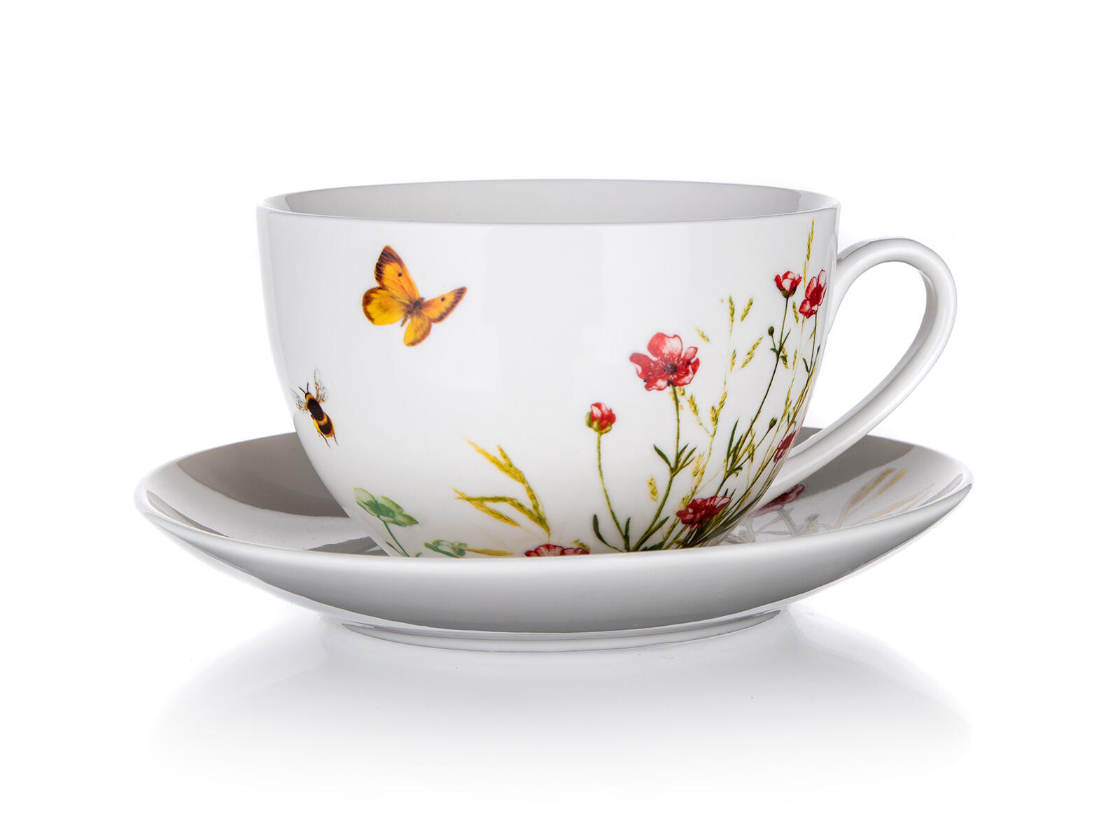 Šálek s podšálkem MEADOW, s krásným květinovým vzorem, se hodí k podávání kávy nebo čaje při všedních i svátečních příležitostech.