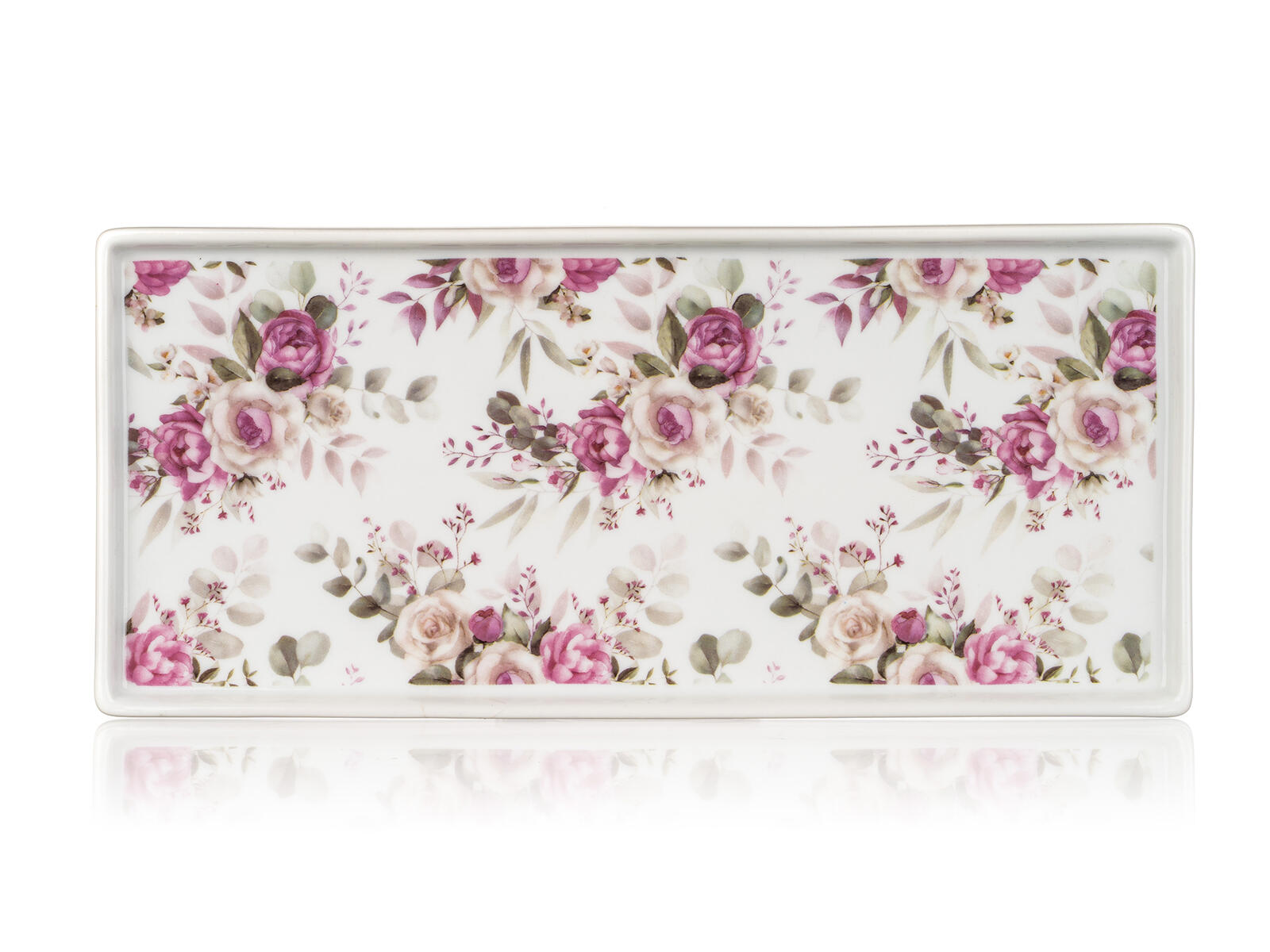 Obdélníkový tác ROSE, s krásným květinovým vzorem, se hodí k podávání studených i teplých pokrmů, při všedních i svátečních příležitostech.